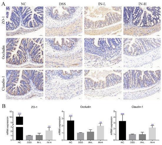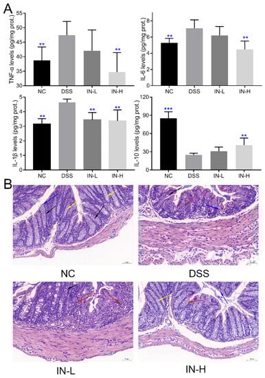 As presented in Figure 2A, the colonic levels of TNF-α, IL-6, and IL-1β of the mice in the DSS group were notably elevated compared to those of the healthy mice in the NC group (p < 0.01), and a high dose of inosine intervention suppressed the DSS-induced elevation in the colonic levels of TNF-α, IL-6, and IL-1β (p < 0.01). However, the inosine intervention at 100 mg/kg only significantly reduced the colonic level of IL-1β in mice with colitis (p < 0.01). Additionally, the DSS treatment dramatically decreased the colonic level of IL-10 in the colitis mice compared to that of the mice in the NC group (p < 0.01). Interestingly, a high dose of inosine intervention significantly elevated the colonic level of IL-10 in mice with colitis (p < 0.01), while there was no significant difference in the colonic level of IL-10 in mice between the DSS and IN-L groups (p > 0.05). These results indicate that the inosine intervention improved the DSS-induced colitis in a dose-dependent manner.