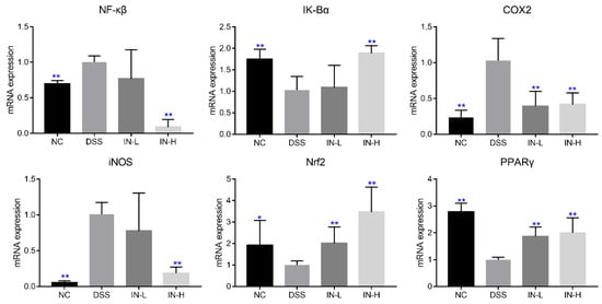 The mRNA transcription levels of genes related to inflammation and oxidative stress were detected via RT-PCR, including NF-κβ, IK-Bα, COX2, iNOS, Nrf2, and PPARγ. As presented in Figure 5, the transcription levels of NF-κβ, COX2, and iNOS were significantly up-regulated in the DSS group compared to those in the NC group, but the transcription levels of IK-Bα, Nrf2, and PPARγ were dramatically down-regulated (p < 0.05). Nevertheless, a high dose of inosine intervention could significantly recover the changes induced by DSS treatment (p < 0.01), but a low dose of inosine intervention only significantly suppressed the transcription level of COX2 in mice with colitis, and up-regulated the transcription levels of Nrf2 and PPARγ (p < 0.05).