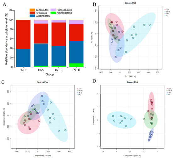 As presented in Figure 6A, Actinobacteria, Bacteroidetes, Firmicutes, Proteobacteria, and Tenericutes dominated the gut microbiota at the phylum level. The inosine intervention in particular increased the relative abundance of Firmicutes in the DSS-treated mice. To deeply explore the effect of inosine on the gut microbiota composition in mice with colitis, PCA, PLS-DA, and SPLS-DA were used to analyze the overall microbial compositions of the mice in the four groups (Figure 6B–D). The results display an obvious separation between the NC and DSS groups, indicating that the DSS treatment significantly shifted the overall microbial composition. However, the inosine intervention obviously recovered the overall microbial composition to a certain extent.