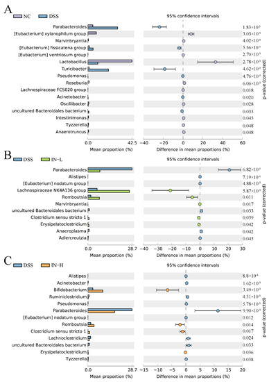 Phylotypes between the NC and DSS groups (A), the DSS and IN-L groups (B), and the DSS and IN-H groups (C) at the genus level were significantly different.