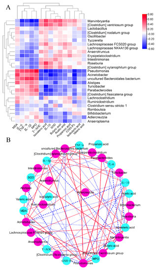 As shown in Figure 8, the concentrations of MDA, IL-6, TNF-α, IL-1β, and MPO were positively associated with the relative abundances of Pseudomonas, Acinetobacter, uncultured Bacteroidales bacteriu, Alistipes, Turicibacter, Parabacteroides, and (Clostridium) fissicatena group, but were negatively associated with the relative abundances of Marvinbryantia, (Clostridium) ventriosum group, Lactobacillus, (Clostridium) nodatum group, Oscillibacter, Tyzzerella, Lachnospiraceae FCS020 group, Lachnospiraceae NK4A136 group, Anaerotruncus, Erysipelatoclostridium, Intestinimonas, Roseburia, and (Clostridium) xylanophilum group. The concentrations of SCFAs and IL-10 and the activities of SOD and GSH-Px were negatively associated with the relative abundances of Pseudomonas, Acinetobacter, uncultured Bacteroidales bacteriu, Alistipes, Turicibacter, Parabacteroides, and (Clostridium) fissicatena group, while they were positively associated with the relative abundances of Marvinbryantia, (Clostridium) ventriosum group, Lactobacillus, (Clostridium) nodatum group, Oscillibacter, Tyzzerella, Lachnospiraceae FCS020 group, Lachnospiraceae NK4A136 group, Anaerotruncus, Erysipelatoclostridium, Intestinimonas, Roseburia, and (Clostridium) xylanophilum group.
