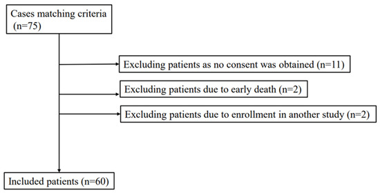 Consort diagram showing the inclusion process. During the research period, 75 patients diagnosed with sepsis according to the Sepsis-3 criteria were admitted to the ICU at our hospital; 15 of these patients were excluded from this study. None of the patients was prescribed antihyperuricemics. Patients were excluded from the study due to lack of consent (n = 11), early death (n = 2), or enrollment in another study (n = 2).