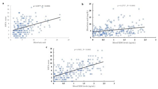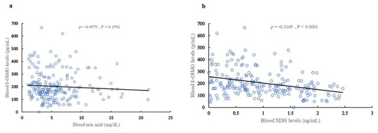A statistically significant correlation was observed between blood UA levels and SOFA score (ρ = 0.3577, p < 0.0001) (Figure 2a), creatinine (Cr) levels (ρ = 0.7623, p < 0.0001) (Supplementary Figure S3a, and estimated glomerular filtration rate (eGFR) (ρ = −0.7719, p < 0.0001) (Supplementary Figure S3b)). There was a weak correlation (ρ = 0.2717, p < 0.0001) (Figure 2b) between blood UA levels and blood XDH levels, and a statistically significant positive correlation was observed between blood XDH levels and the SOFA score (ρ = 0.5852, p < 0.0001) (Figure 2c). Blood XDH levels were correlated with Cre (ρ = 0.3817, p < 0.0001) (Supplementary Figure S3c) and eGFR (ρ = −0.3841, p < 0.0001) (Supplementary Figure S3d). No statistically significant correlation between blood UA levels and blood 8-OHdG levels (ρ = −0.0970, p = 0.1592) (Figure 3a) was observed, but a statistically significant negative correlation (ρ = −0.3169, p < 0.0001) (Figure 3b) was observed between blood XDH levels and blood 8-OHdG levels.