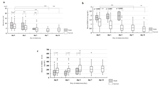 Figure 4a shows changes in blood UA levels. A statistically significant decrease in blood UA levels from day 0 to days 1, 3, 7, and 14 was observed. There was a statistically significant drop on days 3, 7, and 14 compared to that on day 0 (day 3, p < 0.0001; day 7, p < 0.0001; day 14, p < 0.0001) and day 1 (day 3, p = 0.0045; day 7, p < 0.0001; day 14, p = 0.0093). Of the 14 patients in the death group, no change over time on any of the measurement days was observed for blood UA levels (Figure 4a). Figure 4b shows the change in blood XDH levels in the survival group. The results showed a statistically significant decrease in blood XDH levels from day 0 to days 1, 3, 7, and 14. There was a statistically significant drop on days 3, 7, and 14 compared to day 0 (day 3, p = 0.0001; day 7, p = 0.0001; day 14, p = 0.0022). However, no significant changes in blood XDH levels were observed over time in the death group.