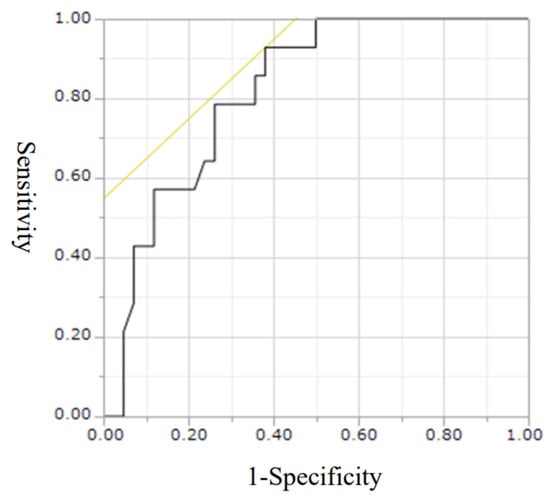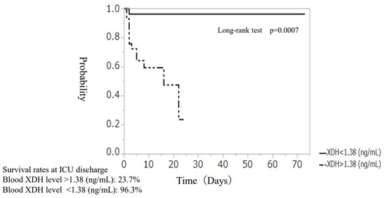 The receiver operating curve (ROC), which was plotted for XDH levels at hospital admission, is shown in Figure 8. The area under the curve (AUC) ROC score was 0.81 for blood XDH levels (p = 0.0002). When the cutoff value for blood XDH was derived, the sensitivity and specificity were 92.8% and 61.9%, respectively, at 1.38 ng/mL. Using this value, we divided the sepsis patients into two groups (blood XDH levels of >1.38 ng/mL and <1.38 ng/mL) and investigated survival rates at the time of ICU discharge. In the blood XDH > 1.38 ng/mL group, the log-rank test showed a statistically significant reduction in survival rate (p = 0.0007). The survival rates were 23.7% for the >1.38 ng/mL group and 96.3% for the <1.38 ng/mL group (Figure 9).