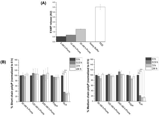 Recombinant h-Prune does not hydrolyze short (13–33 Pi)- and medium (45–160)-chain polyP, even though it conserves its ability to release 5′AMP from cAMP. (A) Graph showing that recombinant h-Prune conserves its PDE activity. To conduct this in vitro study, we assayed the release of 5′AMP from cAMP. Increasing concentrations of h-Prune with 10 mM MgCl2 were tested. PDE was used as a positive control, and assay buffer as a negative control. (B) h-Prune is not able to hydrolyze short (13–33 Pi) and medium (45–160 Pi) chains of polyP after 24 h of the assay in the presence of 5 mM MgCl2. These chain lengths are those that should be more common in mammalian cells. The levels of polyP were assayed using DAPI fluorescence, and ALP was used as positive control. The results are expressed as mean ± SEM. The PDE assay (as it is an enzymatic study) was conducted using experimental triplicates, while the other experiments were conducted using at least experimental and biological triplicates. *** p ≤ 0.001.