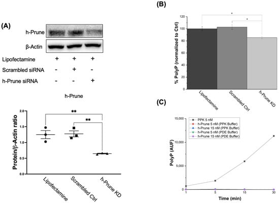 h-Prune KD HEK293 cells show decreased levels of polyP. (A) Significant immunoblots and densitometric analysis that demonstrate decreased levels of h-Prune in HEK293 cells after transfection with siRNA. Note that transfection with scrambled siRNA does not induce any significant changes in the levels of h-Prune. In the densiometric analysis, circles represent individual values from samples treated with lipofectamine; and squares and triangles individual values of samples transfected with Scrambled siRNA and h-Prune siRNA, respectively. (B) Graph showing the levels of polyP in our cellular models. This quantification was conducted by measuring the fluorescence of DAPI-polyP. The levels of polyP are decreased by knocking down Prune. Transfection with the scrambled siRNA did not induce any significant effects on the levels of polyP. (C) The plausible kinase activity of h-Prune was also assayed. However, no variations in the levels of polyP were found in this case either. PPK was used as a positive control, and h-Prune was incubated either in the PPK or the PDE buffer. The results are shown as mean ± SEM. The PPK assay (as it is an enzymatic study) was conducted using experimental triplicates, while the other experiments were conducted using at least experimental and biological triplicates. * p ≤ 0.05, ** p ≤ 0.01.
