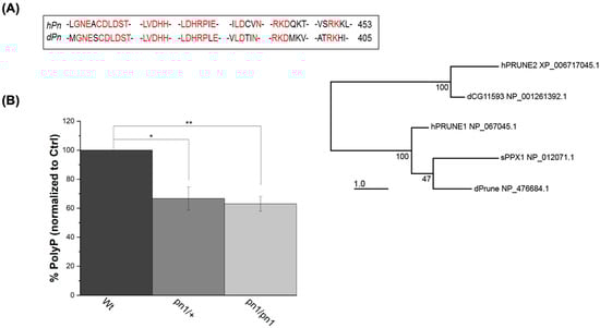 To address whether the effects observed in h-Prune KD HEK293 cells are also present in other species, we decided to investigate the conserved ortholog in Drosophila prune (pn). The phylogenetic analysis reveals that the Drosophila prune protein is closely related to PRUNE1, which encodes for h-Prune [35] (Figure 3A). The protein sequence alignment of the N terminal PPX consensus sequences of Drosophila Prune and h-Prune indicates a strong homology between these two proteins, including an abundance of invariant residues within these aligned sequences (Figure 3A). Subsequently, we extracted and quantified the levels of polyP in the Wt control (Canton S; CS) and Prune mutant (pn1) Drosophila heads. Also, in these samples, we found that the loss of one copy of Prune was sufficient to cause a significant reduction in the levels of polyP, which resulted in comparable levels to those found in homozygous mutants (39% decrease in homozygosis—p value = 0.009—vs. 37% decrease in heterozygosis—p value = 0.026), (Figure 3B). Thus, similarly to what is observed for h-Prune, Drosophila Prune is also required for the maintenance of the levels of polyP. Our findings demonstrate that Prune orthologs have an evolutionarily conserved function in the regulation of the homeostasis of polyP.