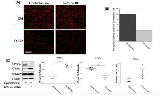In HEK293 cells, the effects of h-Prune on the levels of polyP are mediated by the regulation of the activity of ATP synthase, but not by an effect on the expression of ATP synthase, or on the regulation of mitochondrial membrane potential or mitochondrial biomass. (A) Significant images obtained after loading our cells with TMRM. Note that no major differences are found between control and h-Prune KD HEK293 cells. FCCP 10 μM was used as a positive control to induce mitochondrial depolarization. (B) Assay of the activity of ATP synthase in our samples. Note that decreased levels of the activity of this enzyme are found in h-Prune KD, compared to the levels shown in the control samples. (C) Significant immunoblots and densitometric analysis that corroborate that h-Prune KD HEK293 cells have significantly decreased levels of the protein. Moreover, using the same methods, our data show that the levels of ATP5 are increased in h-Prune KD, while those of TOM20 are not affected by knocking down Prune. In the densiometric analysis, circles represent individual values from samples treated with lipofectamine, while triangles represent individual values from h-Prune KD samples. The results are shown as mean ± SEM of at least three independent experiments. Scale bar: 50 μM. * p ≤ 0.05, ** p ≤ 0.01.