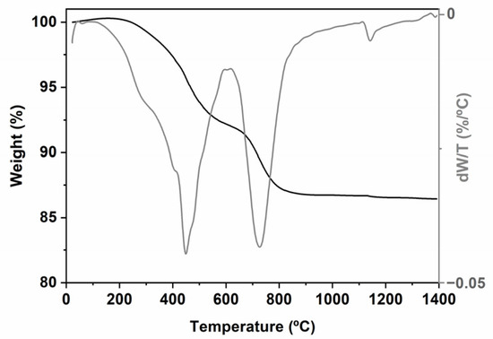 The as-prepared TREOS/DMDPS hybrid displays a high amount of carbon (C (%) = 27.3%, Table 1) and a dense microstructure according to N2 adsorption/desorption results with both negligible SSA, named SBET, and porosity (results not shown here). These findings are due to the presence of the high reactivity of TREOS molecules, which produce a highly cross-linked hybrid [30], as well as the low reactivity of DMDPS molecules that enable the incorporation of phenyl groups, increasing the amount of carbon in the dense hybrid [29]. The TREOS/DMDPS hybrid has been characterized by 29Si Magic angle spinning nuclear magnetic resonance (29Si MAS-NMR) (Figure 1a) and Fourier Transform Infrared (FT-IR) (Figure 1b) spectroscopies and, in addition, its organic to inorganic transformation was followed by thermogravimetric/differential thermogravimetric (TG/DTG) analysis (Figure 2).