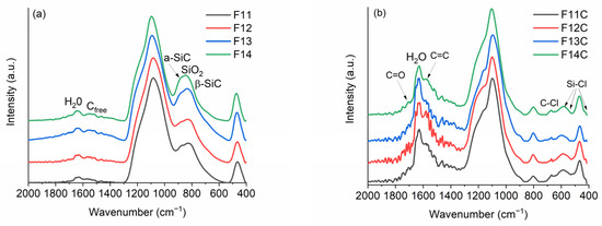 As expected, after Cl2 etching, the bands related to the SiOC network (both SiO and SiC) are drastically reduced as a consequence of the removal of SiC and SiO bonds (Figure 4b). However, in all cases and independently of the pyrolysis temperature, the bands related to silica (1097, 803, and 467 cm−1) can be observed, indicating that it is not totally removed and, of course, the band related to C=C bonds (1570 cm−1) of the Cfree phase can now be clearly observed. In addition, some new bands appear as shoulders located at 1210–1230 and 1710–1750 cm−1, probably related to the formation of C=O functionalities (C=O and C-O stretching, respectively). Some authors assigned the C=O functionalities to lactone, anhydride, and carboxylic groups [4,31,32]. At 671, 590, 524, and 425 cm−1, some small bands related to C-Cl (800–600 cm−1) [31] and Si-Cl (625–425 cm−1) [47] bonds appear with different amounts of chlorine related to some residual moistures after etching and post-treatment in H2. It is important to note that these bands display small intensities, indicating the low residual amount of chlorine in the prepared SiOC-DC materials. The presence of C=O and C-Cl functionalities have been previously observed in SiOC-DC materials etched with Cl2 [4,31,32].