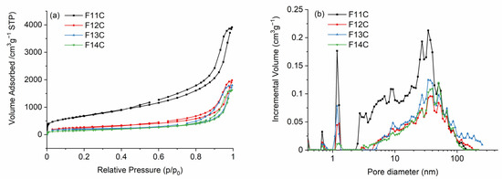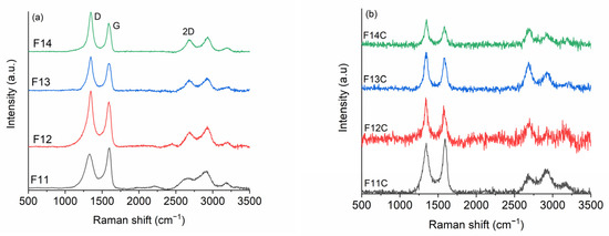 The evolution of the microstructure from SiOC to SiOC-CD materials has been followed by means of N2 adsorption–desorption measurements and FE-SEM images. SiOC materials pyrolyzed at different temperatures display a dense microstructure showing type II isotherms, very low SBET values, and almost negligible porosity in accordance with their pore size distribution (PSDs). It is noticeable that the F12 sample displays a type IVa isotherm with a PSD that indicates a small number of mesopores and a slightly higher SBET value (Figure S1a,b and Table 4). The F12 isotherm has a type H3 hysteresis loop, which could be related to the presence of some macropores [63]. The FE-SEM micrographs are in perfect agreement with these results. F11 (Figure S2a) is a dense material but shows an inhomogeneous surface, F12 (Figure S2b) displays a slightly porous surface, and the surface of F13 and F14 (Figure S2c,d) looks very different, probably ascribed to the phase separation of SiOC and the ulterior crystallization of β-SiC, which is enhanced with the temperature in accordance with both FT-IR (Figure 4) and XRD (Figure 5) results.