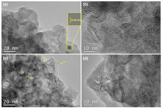 Finally, the HR-TEM images were employed to complete the microstructural characterization of the SiOC-DC materials, which show very different features depending on the initial pyrolysis temperature. The F11C sample displays disordered carbon ribbons (i.e., Cfree phase) surrounded by the remaining SiOC matrix, according to FT-IR results (Figure 4). In addition, an isolated planar carbon domain can be observed (Figure 8b, d-spacing = 0.33 nm related to (002) lattice plane (JPC: 01-075-1621)). A higher magnification image (Figure 8b) mainly shows straight carbon ribbons with fairly similar and homogeneous carbon domains (around eight graphene layers) superimposed but poorly connected. However, the F14C sample shows a microstructure totally different. The lower magnification image displays inhomogeneous but more highly ordered tortuous carbon domains embedded in the remaining SiOC matrix that show a very different amount of graphene layers varying from a couple to 6–8 layers (Figure 8c, indicated by arrows). This result can be due to the presence of defects originating from a higher pyrolysis temperature and the subsequent Cl2 etching. These features can be more clearly observed in a higher-magnification image (Figure 8d), where a high interconnection can be appreciated through curvature and in-plane defects such as vacancies. The presence of pores can also be noticed in both samples. Previous studies indicated the presence of curved carbon (both single graphene sheets and graphite) in SiOC-DC obtained at the pyrolysis temperature of 1200 °C after chlorine etching [2]. It is important to note that these results are not only in agreement with Raman findings but also corroborate them. The Cfree of the F11C sample is planar (La = Leq) with a low degree of interconnection and the highest and least defective one (the highest La and LD values). In addition, the Cfree related to the F14C sample presents highly tortuous carbon domains with both a high degree of interconnection (La < < < Leq) and crystallinity (the highest ΔW2D−1 and I2D/IG values).