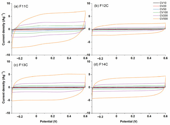 The CV curves (from 10 to 500 mVs−1) for the SiOC-DC materials pyrolyzed at different temperatures after Cl2 etching are represented in Figure 9. As can be clearly seen, in all cases, the SiOC-DC materials display CV curves with an almost rectangular shape, indicating an electrochemical double-layer capacitance behavior up to 1000 mVs−1 (Figure S3a) resembling the quick formation of a double layer, even at high rates with pseudo-capacitance contribution. These features corroborate the low amount of C=O and C-Cl functionalities found by FT-IR in their spectra (Figure 4). The area of the CV curves directly related to the Cs values increases with the scan rate (Figure 9) but not with the pyrolysis temperature, as it was previously observed in HF-etched SiOC-DC materials [16,29]. The maximum values of Cs are obtained for the F11C sample (i.e., SiOC-DC material pyrolyzed at 1100 °C after Cl2 etching), which displays a hierarchical microstructure with the highest values of SBET and the largest amount of micro-, meso-, and macropore volumes (Table 4). In addition, this sample shows the largest and least defective carbon planar domains without the presence of tortuosity (Table 3), as it has been shown in HR-TEM (Figure 8a,b).