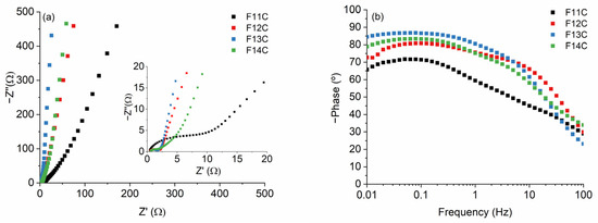 The typical Nyquist plots composed of a semicircle and a vertical line at high and low frequencies, respectively, are collected in Figure 10. The equivalent series resistance (RES), due to the internal resistance of the electrode and the electrolyte, are low and quite similar in all cases (Table 5). This indicates a correct two-electrode system setup configuration. The charge transfer resistance at the electrode/electrolyte interface (RCT) quickly decreases from F11C to the other samples (Table 5). As a first approximation, we only considered that this fact is mainly due to the degree of order determined by the I2D/IG Raman parameter, directly related to the electrical conductivity of the Cfree phase. The I2D/IG values increase with the pyrolysis temperature from 0.27, 0.57, 0.78, and 0.86 for F11C, F12C, F13C, and F14C, respectively (Table 3). The quasi-vertical line at low frequencies also indicates the ideal capacitive behavior of these samples. The lines are steeper as the pyrolysis temperature increases, which again can be associated with the increase in the electrical conductivity of the samples (i.e., Cfree phase) and, therefore, a faster kinetic reaction. The high values of the Bode plots (Figure 10b) indicated the ideal capacitive behavior of the samples, which is in accordance with the shape of CV curves (Figure 9). The time constant (τ0 calculated at a frequency of ≈ 45 °, where τ0 = 1/f0) radically decreases from the F11C to the rest of the samples, again probably ascribed to the higher electrical conductivity of the samples pyrolyzed at higher temperatures. It is important to point out that the value obtained for the F11C sample is slightly lower than those obtained by SiOC-DC after HF etching [16] but also similar to the SiOC-DC materials obtained via Cl2 etching [8,9,10].