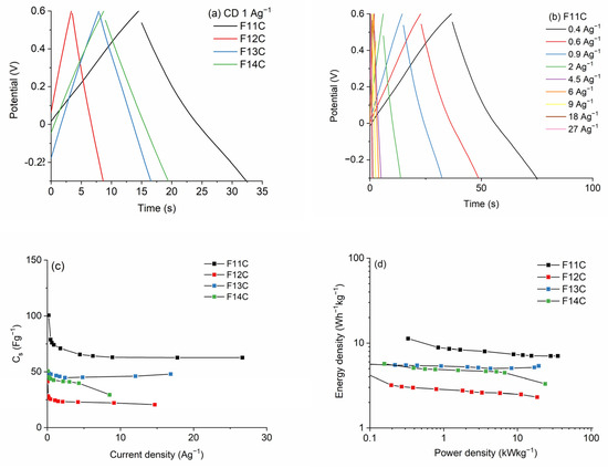 The GCD curves at 1 Ag−1 of the SiOC-DC materials pyrolyzed at different temperatures after chlorine etching are collected in Figure 11a. The quasi-symmetrical triangular shape indicates the typical double-layer capacitive behavior, in agreement with CV and EIS curves. In the case of the F11C (Figure 11b) material, the high retention ratio as the current density increases up to 27 Ag−1 indicates a high rate capacity of this sample. These values are sustainably reduced in the SiOC-DC materials pyrolyzed at higher temperatures (Figure S3b–d). The Cs values calculated by the galvanostatic discharge values for all SiOC-DC materials are depicted in Figure 11c. In accordance with CV curves, the highest values are obtained for the sample F11C, which, in terms of microstructure, is the sample with the largest values of SBET and the largest amount of micro-, meso-, and macropore volumes (Table 4). With respect to the Cfree phase, this sample displays the largest and least defective carbon planar domains (Table 3). At a low current density of 0.2 Ag−1, F11C displays a Cs value of 101 Fg−1. This value decreases up to 63 Fg−1 as the current density increases up to 10 Ag−1 and remains constant at the very high value of 27 Ag−1. These values are similar to or higher than those previously reported for other different SiOC-DC materials also obtained via Cl2 etching [8,9,10,64] but employing different experimental and electrochemical measurement conditions. Previously prepared materials show comparable or similar SBET values but without the presence of pores bigger than 15–20 nm (i.e., meso/macropores). The presence of a great volume of these bigger pores (i.e., meso/macropores > 15–20 nm, Table 4) could explain the good electrochemical response of the F11C sample. Obviously, this sample shows the highest volume of all types of pores, so this is in accordance with the highest Cs values observed. As Sevilla et al. [65] indicated, the presence of bigger pores (i.e., meso/macropores) can produce the formation of channels that promote ion transportation to the lower-size pores (i.e., micropores), which are less accessible, enhancing Cs values. In addition, the Cfree phase cannot be ruled out, and, in this sense, F11C is composed of the largest and least defective carbon domains, which also play a positive role in the Cs values. On the contrary, better kinetic behavior is observed for the other samples pyrolyzed at higher temperatures (i.e., F12C, F13C, and F14C) that display a high degree of order and, therefore, a higher electrical conductivity (i.e., lower impedance values, Figure 10a). However, this effect is attenuated by the huge decrease in the SBET and by the micro-, meso-, and macropore volumes (Table 4).