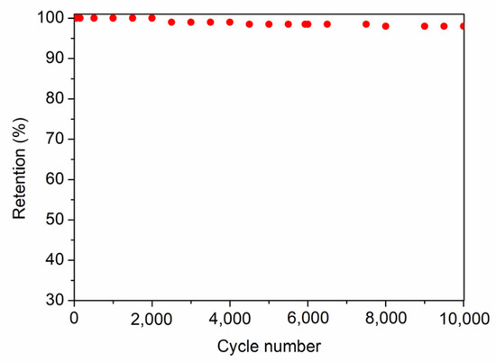 Finally, the cycling stability test at a charge/discharge current density of 0.5 Ag−1 of the sample with the highest capacity was determined employing LBT21084 (Arbin Instruments, College Station, TX, USA) testing equipment up to 10,000 cycles.