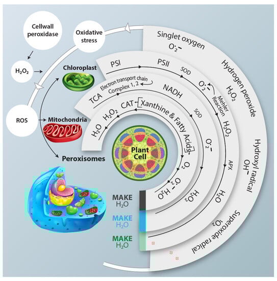 ROS activated by MAPK cascade pathway-controlled ROS generation activate defense systems against abiotic stress [118]. ROS generated due to drought stress act as signaling molecules in vegetable plants, triggering programmed cell death (PCD) pathways through oxidative stress-induced signaling cascades and gene activation, leading to controlled cellular breakdown and adaptation to stress conditions. Stability and diffusivity make H2O2 a vital messenger molecule in animal and plant cells among ROS. Peroxisomes and chloroplasts generate H2O2 quicker than mitochondria during drought stress, although mitochondria are most sensitive to oxidative damage [119,120]. High mitochondrial H2O2 levels may suggest antioxidant defense intensification or planned cell death under extreme oxidative stress. H2O2 controls gene expression, protein phosphorylation, and calcium mobilization. Pei et al. [121] linked ABA-induced stomatal closure to H2O2 and Ca2+ channel activation in guard cells. Mori et al. related ROS signaling to stomatal closure [122]. Yan et al. found that ABA induces ROS, signaling stomatal control [123]. H2O2 also phosphorylates MAPK, which affects downstream gene expression cascades [124].