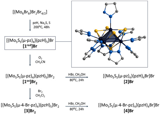 In this context, we have recently demonstrated the preparation of a new representative of chalcogenide molybdenum clusters, namely square pyramidal [{Mo5(μ3-Se)i4(μ4-Se)i(μ-pz)i4}(pzH)t5]1+/2+ (i = inner, t = terminal (basal and apical), denoted as Mo5Se5red/ox) [24]. Clusters obtained in two steps (via an amorphous intermediate of unknown structure “NaMo6Se8Br4”) from Mo6Br12 in low yield (about 30%) show reversible redox transitions between paramagnetic and diamagnetic states. The aim of this work is to extend the family of square pyramidal clusters to demonstrate the chemical modification and to study the physicochemical properties. Novel S-containing clusters [{Mo5(μ3-S)i4(μ4-S)i(μ-pz)i4}(pzH)t5]1+/2+ (denoted as [1red/ox]) were obtained in one step with high yield (~60%) starting from Mo6Br12 (Figure 1). The ligand environment can be modified in two ways: (i) interaction with HBr resulting in selective substitution of the apical pyrazole ligand by Br-ligand to form [{Mo5(μ3-S)i4(μ4-S)i(μ-pz)i4}(pzH)bs4Bra]+ (denoted as [2], bs = basal, a = apical) or (ii) interaction with Br2 resulting in selective bromination of the bridging pyrazolate ligands to form [{Mo5(μ3-S)i4(μ4-S)i(μ-4-Br-pz)i4}(pzH)t5]2+ (denoted as [3]) (Figure 1). It is also possible to perform a sequential modification of clusters, combining both bromination of pyrazolate ligands and substitution of the apical ligand, resulting in the compound [{Mo5(μ3-S)i4(μ4-S)i(μ-4-Br-pz)i4}(pzH)bs4Bra]+ (denoted as [4]). All the compounds obtained were characterized in detail using a series of physicochemical methods of analysis, both in the solid state (single-crystal and powder X-ray diffraction analysis, elemental analysis, FTIR, etc.) and in solution (NMR spectroscopy and mass spectrometry). The influence of the modification of the cluster complexes on the redox properties as well as on the absorption in the ultraviolet-visible (UV-vis) and near-infrared (NIR) region is demonstrated.
