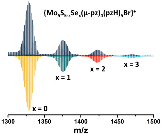 Note that in this reaction, elemental sulfur (or Na2Sn, which can be formed under such conditions) acts as an oxidizing agent for the transition of MoII to MoIII. To confirm the importance of sulfur in this reaction, an additional experiment was performed in which elemental sulfur was replaced by elemental selenium. Despite the significant difference in the redox properties of the elemental compounds, a green product was isolated in this reaction (yield~90 mg starting from 200 mg of Mo6Br12), which, according to high-resolution electrospray mass spectrometry (HR-ESI-MS), is a mixture of compounds with the composition [{Mo5S5−xSex(μ-pz)4}(pzH)5]2+ (x = 0, 1, 2, 3) (Figure 2). Thus, in addition to the role of oxidant, elemental sulfur/selenium also acts as source of inner ligands.