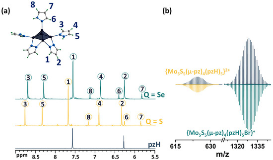(a) 1H NMR spectra of pentanuclear clusters [{Mo5Q5(μ-pz)4}(pzH)5]2+ (Q = S, Se) in CD3OD in comparison with pyrazole. (b) Fragment of mass spectrum of [1ox]Br2 solution in acetonitrile (dark blue) and calculated forms (colored). Numbers in circles on the NMR spectra correspond to the numbers of hydrogen atoms in the structure.