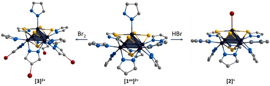 The first approach was realized by the interaction of [1ox]Br2 with concentrated hydrobromic acid in methanol. Note that this process can be carried out in the presence of other acids (e.g., acetic acid, phosphoric acid), including prolonged soaking in methanol, which is itself a weak acid. Previously, when studying the [{Mo5(μ3-Se)i4(μ4-Se)i(μ-pz)i4}(pzH)t5]1+/2+ clusters, we also observed the substitution of the apical pyrazole upon standing in methanol, which we suggested was related to the coordination of methanol [24]. Apparently, in this case, the apical pyrazole is more labile under “acidic” conditions and the coordination of the Br anion, which is always present as a counterion in Mo5 complexes, is most preferred. This equilibrium can be completely shifted to the complex with the apical bromine ligand by the addition of hydrobromic acid. The second modification approach was realized by the interaction of [1ox]Br2 with Br2 in methylene chloride. In this reaction, the hydrogen atom in the fourth position of the pyrazolate ligand is electrophilically substituted with bromine. In both cases, other ligands are not involved in the reactions.