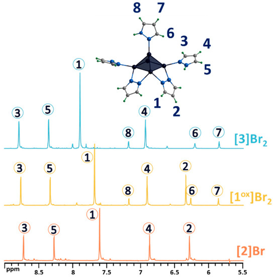 1H NMR spectra of pentanuclear clusters [1ox]Br2, [3]Br2 and [2]Br in CD3OD. Due to the low solubility of [2]Br in methanol, the spectrum contains low intensity signals from impurities with higher solubility. Numbers in circles on the NMR spectra correspond to the numbers of hydrogen atoms in the structure.
