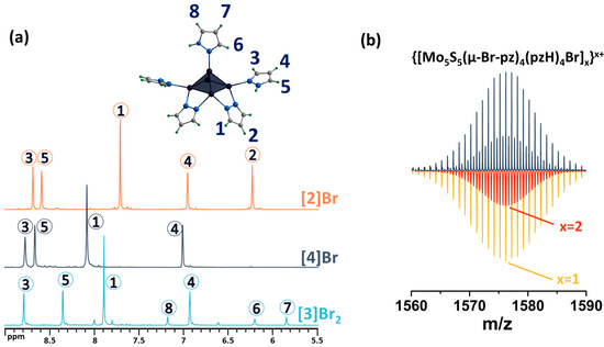 The final stage of modification of the ligand environment of the five-nuclear cluster was carried out by successively implementing the above approaches: bromination of the pyrazolate ligands and replacement of the apical pyrazole with bromine, yielding [{Mo5(μ3-S)i4(μ4-S)i(μ-4-Br-pz)i4}(pzH)bs4Bra]Br (denoted as [4]Br). Performing a sequential modification is no different from performing each modification separately. The reaction product was also characterized in detail using a number of analytical methods (see Materials and Methods), including studies in solution. The absence of apical ligand signals in the 1H NMR spectrum confirms the substitution of the ligand with bromine, and the preservation of the signals of the remaining ligands indicates the absence of effect of this modification on functionalized pyrazolate ligands (Figure 6 and Figures S14–S18). The mass spectrum of the compound also contains the necessary forms, for example, {[{Mo5S5(μ-4-Br-pz)4}(pzH)4Br]}+ (Figure 6 and Figure S19).