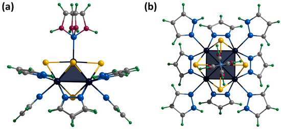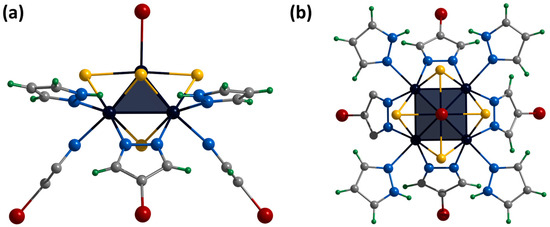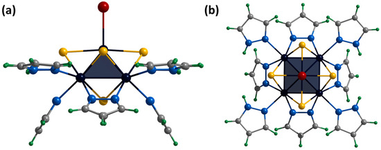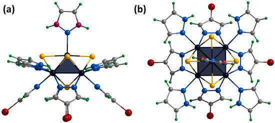Crystal structure of cationic cluster [{Mo5(μ3-S)i4(μ4-S)i(μ-4-Br-pz)i4}(pzH)t]2+: side (a) and top (b) view. Color code: Mo5—dark blue square pyramid, S—yellow, N—blue, C—grey, H—green, Br—red, disordered C/N—purple.
