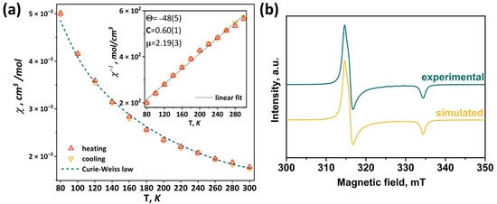 Temperature dependence of magnetic susceptibility (a) and EPR spectrum measured at 77 K in comparison with simulated one (b) of [1red]Br. Inset: linear fitting of inverse magnetic susceptibility.