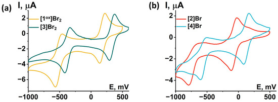 Cyclic voltammetry of the clusters (0.5 mM) in 0.1 M Bu4NClO4 dichloromethane solution for (a) [1ox]Br2 and [3]Br2 and (b) [2]Br and [4]Br. Scan rate—100 mV/s. Reference electrode: Ag/AgCl/3.5 M KCl.