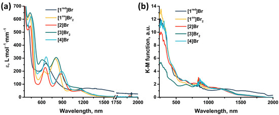 (a) UV-vis-NIR spectra of compounds obtained in acetonitrile or DMSO (only for [4]Br) solutions. The absorption region 1650–1750 nm is not presented due to the strong absorption of the solvents. (b) Diffuse reflectance spectra converted to absorption spectra using the Kubelka–Munk function.