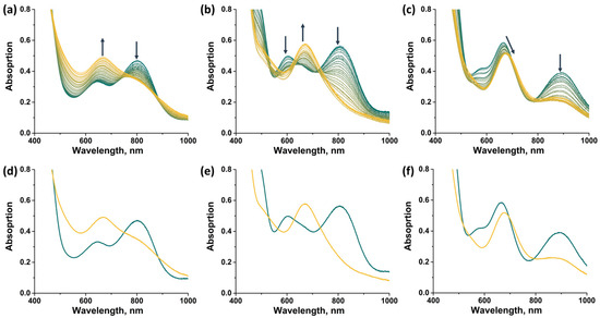 In this work, spectroelectrochemical (SEC) experiments were also carried out to demonstrate the possibility of a rapid change in the absorption spectrum of the complexes by applying electric potential (Figure 14). For all compounds, the transition from 14 VEC (MoIII4MoIV) to 15 VEC (MoIII5) was studied, with the exception of [2]Br, the oxidation of which leads to the precipitation of a neutral, sparingly soluble form [{Mo5(μ3-S)i4(μ4-S)i(μ-pz)i4}(pzH)bs4Bra], making it difficult to record the spectra. In all cases, a decrease in absorption in the NIR region and a shift in the absorption band in the visible region are observed during the one-electron reduction. The absorption spectrum obtained in the case of [1ox]Br2 is in good agreement with that described above for [1red]Br, confirming the transition from 14 to 15 VEC cluster. The absorption spectra obtained for the other two complexes should correspond to the reduced forms [{Mo5(μ3-S)i4(μ4-S)i(μ-4-Br-pz)i4}(pzH)t]Br and [{Mo5(μ3-S)i4(μ4-S)i(μ-4-Br-pz)i4}(pzH)bs4Bra]. Thus, the one-electron reduction makes it possible to control the absorption in the NIR region.
