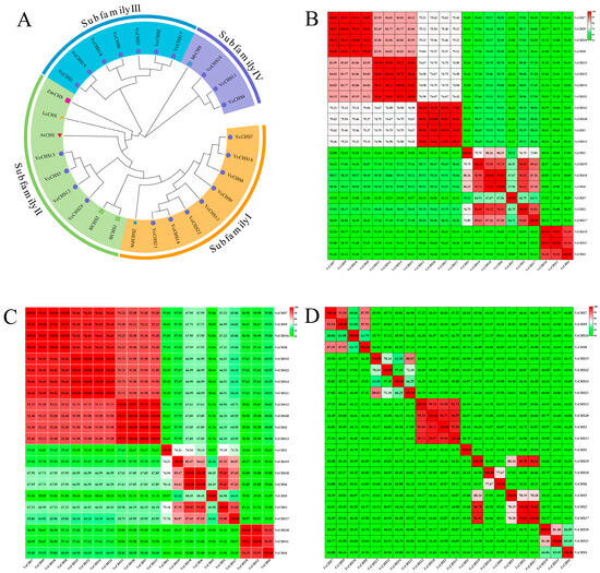 The similarities of the 22 VcCHSs encoded proteins ranged from 39.56% to 100% (Figure 1C). The similarities among Subfamily I members ranged from 96.40% to 100% (the similarities among VcCHS16 and VcCHS7, VcCHS8 and VcCHS9, and among VcCHS14, VcCHS15, VcCHS21 and VcCHS22, were all 100%). The similarities among Subfamily II members were all higher than 99% (99.75~100%, with 100% similarity among VcCHS3, VcCHS13 and VcCHS20). The similarities of Subfamily III members ranged from 55.97% to 100% (VcCHS6 and VcCHS18), and the similarities of Subfamily IV members ranged from 94.35% to 99.26% (VcCHS10 and VcCHS11).