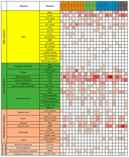 Studies have found that CHS promoters contain many light-responsive elements []. Consistently, by analyzing the cis-acting elements in the VcCHS promoters, 17 kinds of light-responsive elements with a total number of 111 were identified (Figure 4). Notably, 19 (86.4%) VcCHS promoters contained the Box 4 element, 18 (81.8%) promoters contained the GT1-motif element and 17 members (77.3%) had the G-box element on their promoters. The CACGTG sequence is a bHLH binding site in the promoters of CHS genes []. Further sequence search revealed that this sequence could be found in promoters VcCHS7, VcCHS8, VcCHS9, VcCHS10, VcCHS11 and VcCHS15, which were predicted to be of the G-box. Although the G-box element was not predicted on the VcCHS21 promoter, there was a G-box (CACGTG) in its promoter, suggesting that bHLH could also bind to its promoter.