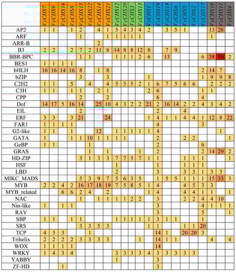 Predicted transcription factor binding sites in the promoters of VcCHS genes.