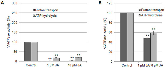 Interestingly, Ratajczak et al. [39] described upregulation of ATP hydrolysis after the hormone treatment; however, they were unable to demonstrate Bafilomycin A1-sensitive H+ translocation into tonoplast vesicles isolated from barley leaves incubated with MeJA. Thus, the authors supposed that MeJA increases vacuolar membrane permeability [39]. This hypothesis explains the much stronger JA effect on proton transport than on ATP hydrolysis catalyzed by the cucumber proton pump (Figure 1A,B).