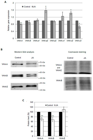 The activity of V-ATPase as a multi-subunit enzyme is complicated and regulated by many different mechanisms [2]. Numerous studies [38,42,43,44] have demonstrated uncoordinated transcription of VHA genes in response to different stimuli, suggesting that particular proton pump subunits play specific roles in enzyme regulation. In addition, it was shown that downregulation [45] or overexpression [46,47] of a single VHA gene affects V-ATPase activity. Thus, changing the level of one protein that builds the holoenzyme modulates its functioning. Our analysis showed that JA treatment induces a significant decrease in the amount of VHA-A and VHA-B (Figure 2B,C). This should be at least partially responsible for the observed V-ATPase downregulation, especially because these two subunits build the catalytic head of the enzyme [2]. A simultaneous decrease in V-ATPase activity and VHA-A and VHA-B content was also observed in the Vigna unguiculate hypocotyls under saline conditions [48].