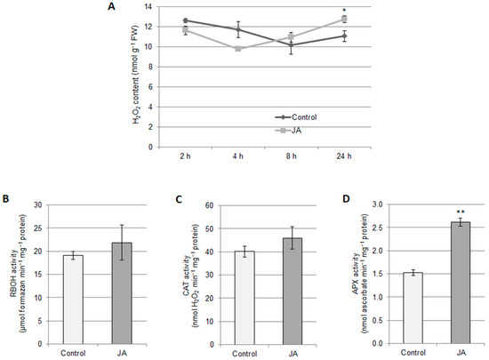 As we have demonstrated previously, the signaling molecules H2S and H2O2 control the V-ATPase activity in the roots of cucumber seedlings, acting as positive and negative regulators of this enzyme, respectively [31]. For this reason, the interrelationships between JA and both molecules were analyzed. Treatment of plants with JA for 24 h significantly increased the endogenous H2O2 level in roots to 115% of the control. In contrast, short-term exposure of cucumber seedlings to JA (2 h, 4 h, and 8 h) did not result in significant changes in the H2O2 content (Figure 3A). The observed increase in H2O2 level could be related to the action of H2O2-generating or decomposing enzymes. However, no changes in the activities of plasma membrane NADPH oxidase and catalase were found after plant treatment with JA for 24 h (Figure 3B,C). Under the same conditions, the activity of APX was stimulated, achieving approximately 170% compared to the control (Figure 3D).