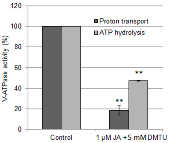JA-dependent V-ATPase regulation under DMTU, an H2O2 scavenger. 1 μM JA with the addition of 5 mM DMTU was introduced to the growing medium for 24 h. The data represents the means of 3 biological repetitions ± SE. The mean ATP-dependent proton transport of control samples was 0.66 ΔA495 min−1 mg−1 protein (100%). The hydrolytic activity of V-ATPase reached a mean value of 163.56 μg Pi h−1 mg−1 protein in control samples (100%). Statistically significant differences (one-sample t test) between the control and treatments are marked as ** (p < 0.01).
