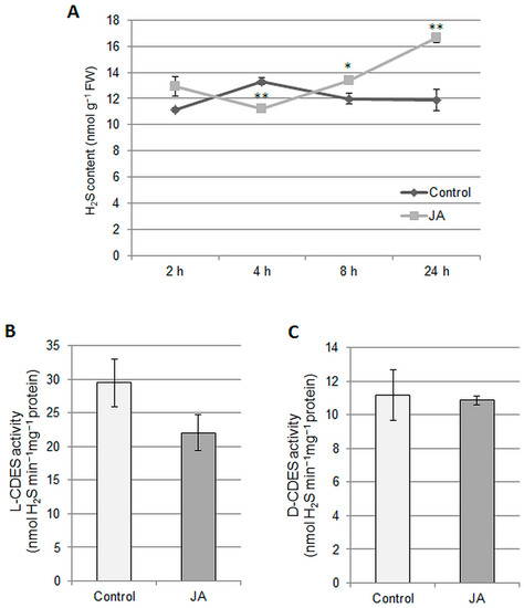 It is well established that there is a close relationship between the response to jasmonates and the transcriptional induction of sulfur assimilatory genes [60,61]. However, knowledge about the activation of hydrogen sulfide-generating enzymes in response to this hormone is still scarce. Therefore, upregulation of H2S levels has been shown in leaves of Setaria italica [62] and Arabidopsis [30,63] after JA or MeJA exposure, respectively. Similarly, H2S content in cucumber roots fluctuates after JA application (Figure 5A), suggesting that H2S can function as a secondary transmitter in the JA-dependent signaling network. In Arabidopsis, L-Cys desulfhydrase and D-Cys desulfhydrase have been identified as the main sources of H2S produced in response to MeJA [63], while in C. sativus, neither of the two enzymes was stimulated by JA (Figure 5B,C). Thus, in cucumber, other H2S-generating enzymes participate in this process or, alternatively, downregulation of H2S-assimilatory enzymes, such as O-acetylserine (thiol) lyase, occurs in response to the hormone.