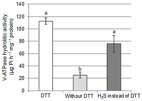 Our previous results [31] indicated that exogenously applied NaHS (H2S donor) stimulated the tonoplast proton pump in cucumber roots; however, the precise mode of H2S action has not yet been clarified. Therefore, in the current work, we tested the possibility of a direct effect of this signaling molecule on the V-ATPase. We compared the hydrolytic activity of V-ATPase in tonoplast vesicles isolated from cucumber roots in three different ways: using a standard procedure with the presence of DTT in all solutions, in the absence of DTT, or using buffers enriched with NaHS instead of DTT. The DTT and H2S concentrations were equal, 1 mM or 5 mM, depending on the isolation step. As shown in Figure 6, the presence of H2S in buffers increased the hydrolytic activity of the enzyme approximately threefold compared to that observed in vesicles isolated without DTT, suggesting that H2S protects V-ATPase from oxidation-dependent downregulation. At the same time, no significant differences were found between the enzyme activities measured using DTT or NaHS during isolation (Figure 6).