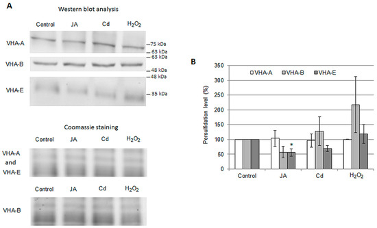 Persulfidation of the proton pump subunits. (A) Upper panel—representative image of Western blot analysis of VHA-A, VHA-B, and VHA-E subunits in the fraction of persulfidated proteins isolated from Cucumis roots exposed to 1 μM JA, 100 μM CdCl2, or 5 mM H2O2 for 24 h. Lower panel—Coomassie staining of a part of the gel without proteins of interest used as a protein loading control. (B) Average level of persulfidation of cucumber V-ATPase subunits A, B, and E treated with 1 μM JA, 100 μM CdCl2, or 5 mM H2O2. The intensity of the Western blot signals was analyzed using ImageLab™. The results are presented as the % of subunit persulfidation measured under control conditions (100%). Data represents the means of 3–5 biological repetitions ± SE. Statistically significant differences (one-sample t test) between the control and treatment are marked as * (0.01 ≤ p < 0.05).
