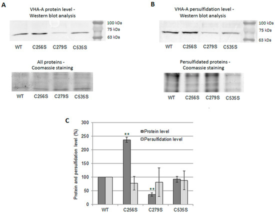 Persulfidation of the VHA-A subunit in Arabidopsis thaliana WT and mutants with substitution of a single Cys residue to Ser (C256S, C279S, and C535S). (A) Upper panel—representative image of Western blot analysis of total protein extract from A. thaliana leaves with anti-VHA-A antibodies; the numbers on the right represent the molecular weight marker overlay using ImageLabTM. Lower panel—Coomassie staining of a part of the gel without proteins of interest used as a protein loading control. (B) Upper panel—representative image of Western blot analysis of the VHA-A subunit in the fraction of persulfidated proteins isolated from A. thaliana leaves; the numbers on the right represent the molecular weight marker overlay using ImageLabTM. Lower panel—Coomassie staining of a part of the gel without proteins of interest used as a protein loading control. (C) Average level of VHA-A protein and its persulfidation in leaves of A. thaliana WT and mutants. The intensity of the Western blot signals was analyzed using ImageLab™. The results are presented as the % of protein level or persulfidation level measured in WT plants (100%). The data represents the means of 3–4 biological repetitions ± SE. Statistically significant differences (one-sample t test) between the control and treatments are marked as ** (p < 0.01).