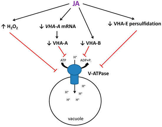 To expand our previously proposed model of proton pump regulation in Cucumis sativus roots [31], in this study we aimed to explain the role of JA in this process. We showed that JA, similarly to Cd, is involved in the downregulation of vacuolar H+-ATPase in cucumber. To determine the mechanism of JA action, the gene expression and protein level of selected VHA subunits were analyzed in plants exposed to this hormone. To verify the possibility that H2S and H2O2 function as downstream components of JA-dependent V-ATPase regulation, H2S and H2O2 levels were analyzed in JA-treated plants. Moreover, V-ATPase activity was measured under H2O2 deprivation conditions, and persulfidation of selected V-ATPase subunits was determined in control, Cd-, H2O2- and JA-treated cucumber plants. Using Arabidopsis mutants, three conserved Cys residues of VHA-A were analyzed to identify which of them are targeted by this modification. Finally, the signaling pathways induced by the two negative regulators of the pump, JA and cadmium, were compared.