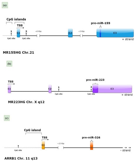 The structure of the miRNA host genes and the location of pre-miRNA sequences with selected CpG sites. Black dots and numbers indicate selected CpG sites. (a) The miR-155 gene is located within exon 3 of the MIR155HG host gene and is regulated by the MIR155HG promoter []. Upstream (−400 bp and −80 bp) of the transcription site start (TSS) are two CpG islands, according to MethPrimer software (https://www.urogene.org/methprimer/ accessed on 7 November 2022); (b) the miR-223 gene is located within exon 3 of the MIR223HG host gene. The region upstream of exon 3 of the MIR223HG gene is believed to regulate miR-223 expression []. (c) The miR-326 gene is located within the first intron of the ARRB1 gene (arrestin beta 1) and is regulated by the ARRB1 promoter (the figure shows a fragment of the ARRB1 gene, arrows represent the continuity of the gene) []. MethPrimer (https://www.urogene.org/methprimer/ accessed on 7 November 2022) indicates CpG-rich region −600 bp upstream of the transcription site start (TSS).