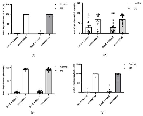 Comparison of the total level of cytosine modifications (5-mC and 5-hmC) with the level of unmodified cytosines within the selected CpG site in MS patients and controls. (a) CpG-1 within the miR-155 promoter. (b) CpG-1 within the miR-223 promoter. (c) CpG-2 within the miR-223 promoter. (d) CpG-2 within the miR-326 promoter. Data are presented as individual points with median.