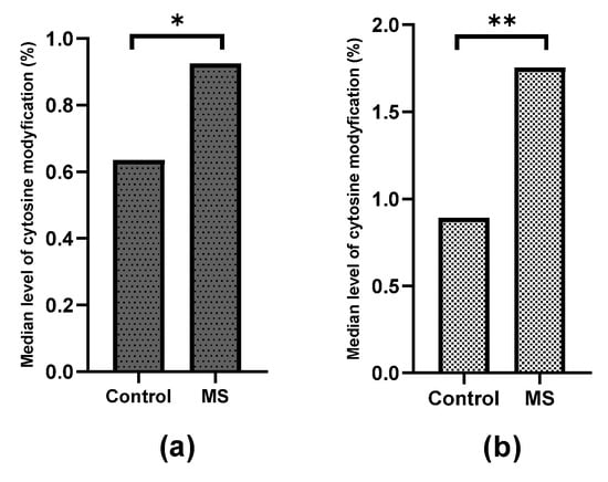 Comparison of the level of total cytosine modifications (5-hmC + 5-mC) between patients and controls. (a) CpG-1 within miR-155 promoter. (b) CpG-2 within miR-326 promoter. The groups of data were compared using the Mann–Whitney U-test (* indicate statistical significance at a p < 0.05, ** indicate statistical significance at a p < 0.01).