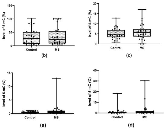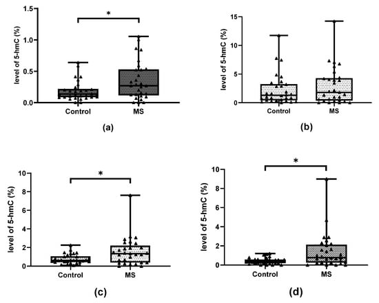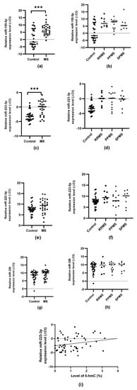 Nevertheless, the identified differences between the group of MS patients and controls indicate that the selected CpG sites indeed have regulatory potential. Interestingly, although methylation is considered to be the key regulatory modification of cytosine, no differences in the level of 5-mC were found in the analyzed sites; however, the total level of 5-hmC and 5-mC was greater in the MS patient group compared to controls, which may indicate that the 5-hmC markers may play a more significant role in the modulation of miRNA expression than was previously assumed. Pan et al. identified an association between the elevated 5-hmC level and an increase in miR-365-3p transcription in mice [], suggesting that a similar regulation of miRNA expression may occur in humans.