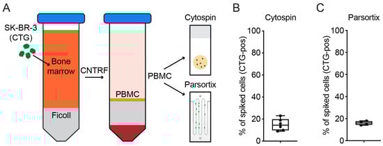 Spiking experiments with Ficoll gradient enrichment of PBMC. (A) Workflow of experiment. SK-BR-3 cells (Cell Tracker Green labeled) were spiked in whole BM followed by PBMC isolation. The PBMC fraction was then subjected to either cytospinning or Parsortix enrichment. CTG-positive cells were then counted on cytospins (B) or in the Parsortix cassette (C). (B) Box plot for enumerated CTG-positive cells on cytospins normalized to the total number of spiked cells (n = 6). (C) Box plot for enumerated CTG-positive cells present in the Parsortix harvest cassette normalized to the total number of spiked cells (n = 4).